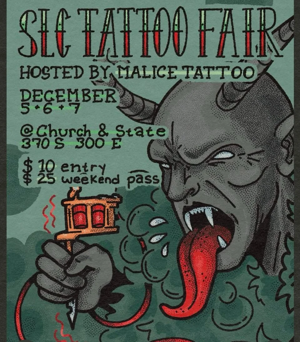 Join us at the SLC Tattoo Fair at Church & State in Salt Lake. We are so excited to be a part of this event, hosted by Malice Tattoo! There will amazing Tattoo Artist and Piercers. they will also have great vendors, Krampus, delicious food and drinks.